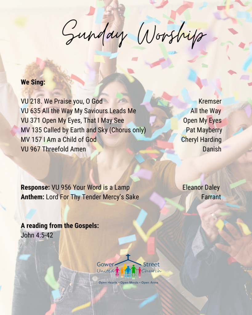 Bulletin Dedications: The Worship and Sacraments Committee invites members of our faith community to help with the cost of printing weekly bulletins. It costs us approximately $15.00 to have color-printed bulletin covers. You may dedicate a bulletin of any Sunday in memory of a loved one, in celebration of a significant event, or in celebration of a life's milestone. The name of Memoriam/Celebration/Milestone and Donor will appear in the bulletin on the specified Sunday. Please forward any donations to the church office and contact Felyn, the office administrator, during office hours via email (gsuc@nl.rogers.com) or phone 709-753-7286 ext. 200.