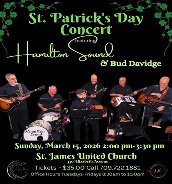 St. James United Church St. Patrick's Day Concert: A reminder that the St. Patrick Day Concert performance by Hamilton Sound and Bud Davidge is coming up on Sunday, March 15th from 2 pm to 3:30 pm. This promises to be a great concert and an opportunity to generate revenue for the church. Tickets are $35 and are available by calling the church office 709-722-1881 or emailing info@stjamesuc.org Tuesdays to Fridays from 8:30 am - 1:30 pm. (Please note that the church office is closed at 1:30 pm.)